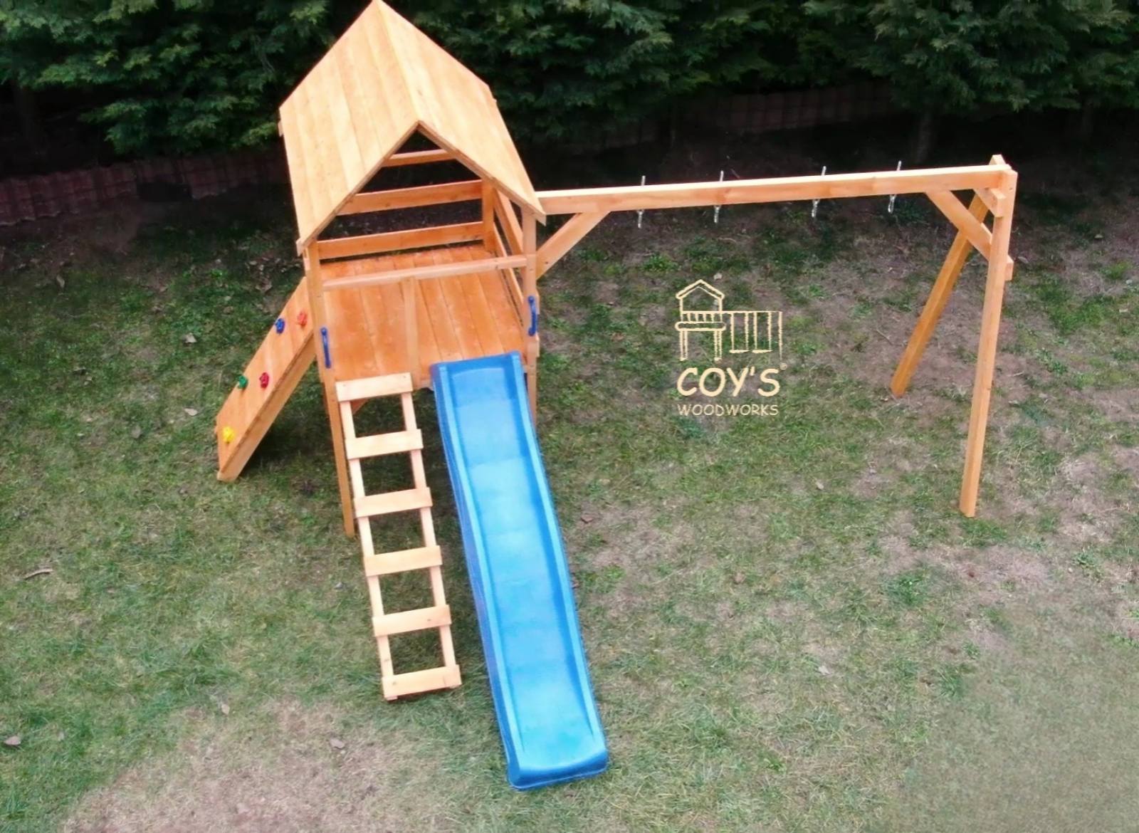 A hintaállvány 250 cm, a csúszda ~210 cm-t, a létra ~110 cm-t lóg túl. A hintaállvány alkalmas fészekhinta befogadására is.