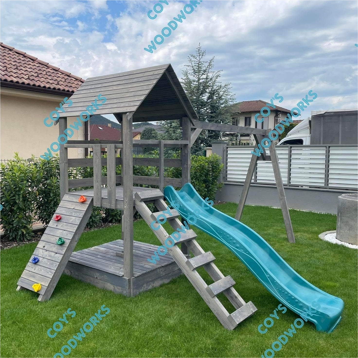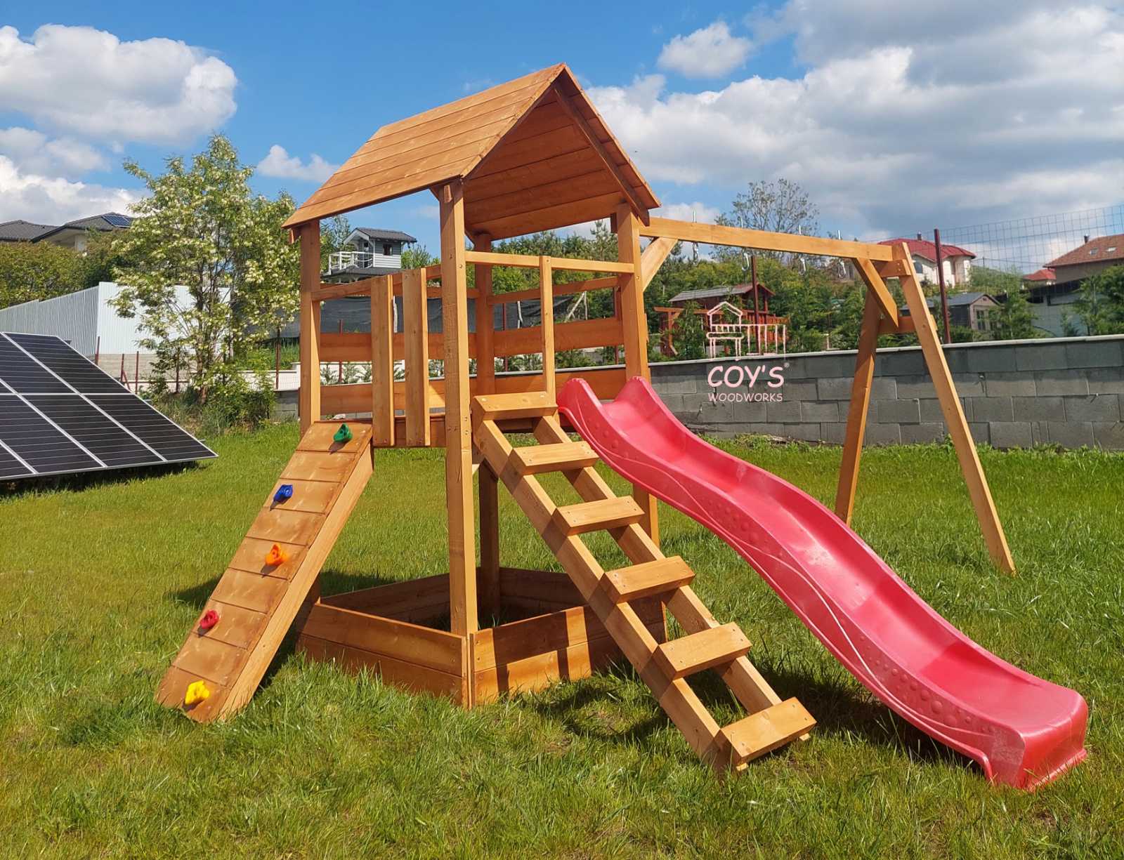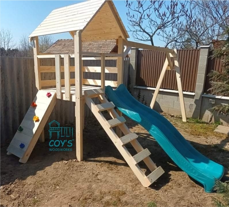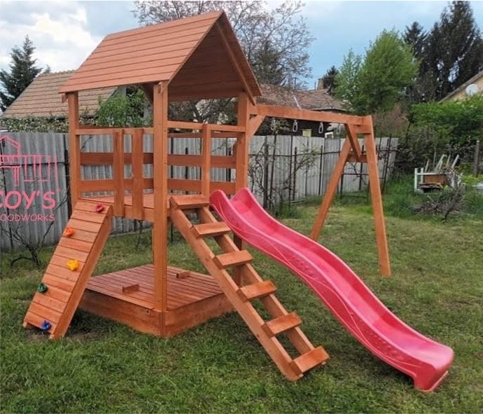 Kiegészíthető a torony mászófallal illetve homokozókerettel vagy fedhető homokozóval (nem alakítható paddá).